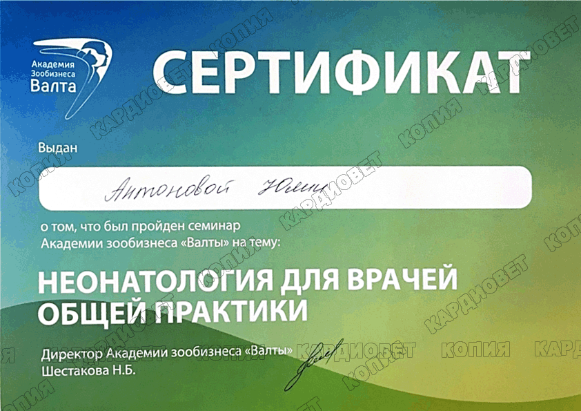2022 г. - Неонатология для врачей общей практики, участник семинара, академия зообизнеса "Валта"