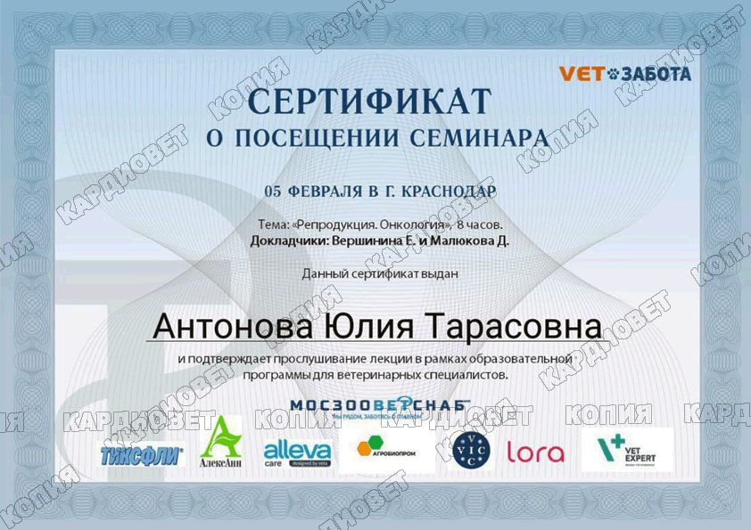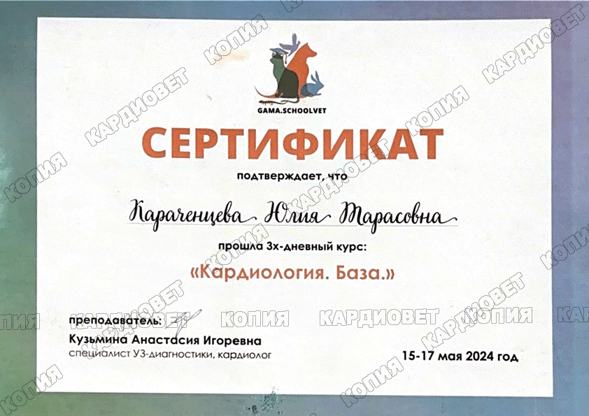 2025 г. - по н.в., ветеринарная клиника "КардиоВет", врач ультразвуковой диагностики, репродуктолог