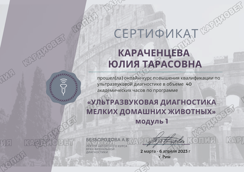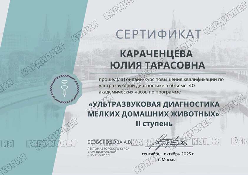 2023 г. - Ультразвуковая диагностика мелких домашних животных, 1 ступень, Безбородова А.В.