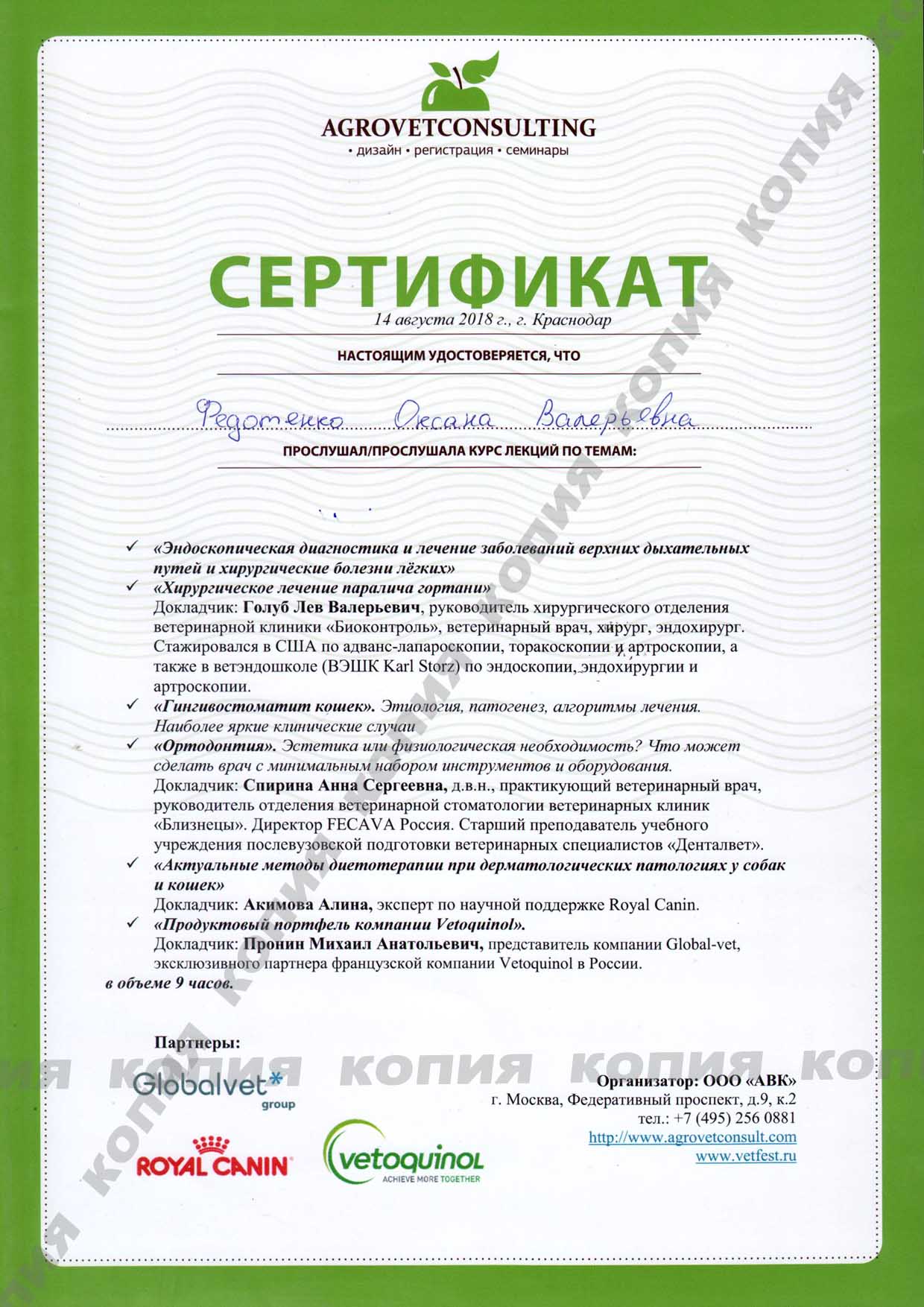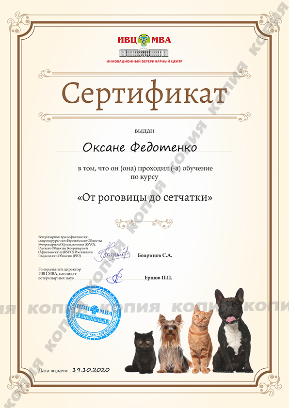 2020 г. - Москва - Курсы повышения квалификации по офтальмологии "От роговицы до сетчатки" при Инновационном Ветеринарном Центре Московской Ветеринарной Академии им. К.И. Скрябина