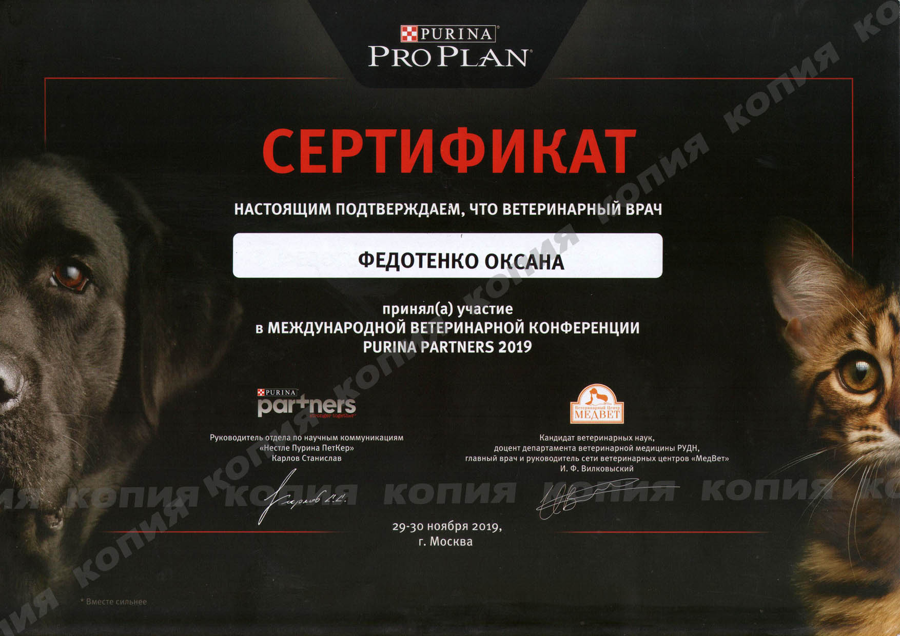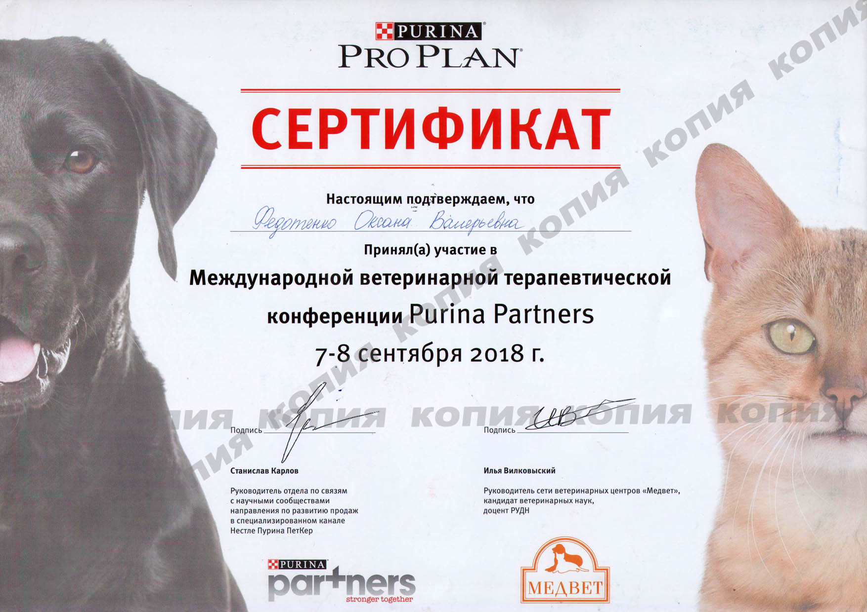 2019 г. - Москва - Участник III международной ветеринарной конференции PURINA Partners, посвященной вопросам ветеринарной хирургии