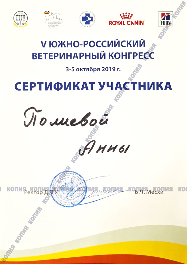 2019 г. - Ростов-на-Дону - Участник V Южно-Российского ветеринарного конгресса