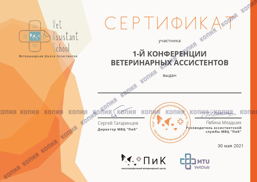 2021 г. - Санкт-Петербург - Участник 1-й конференции ветеринарных ассистентов, онлайн