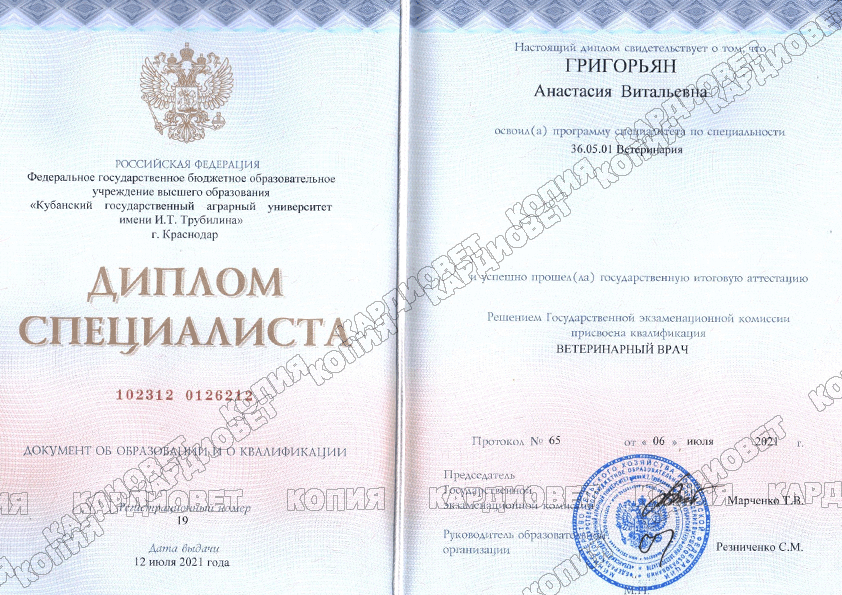 Кубанский государственный аграрный университет (КубГАУ), специальность - "Ветеринарный врач", 2021 г.