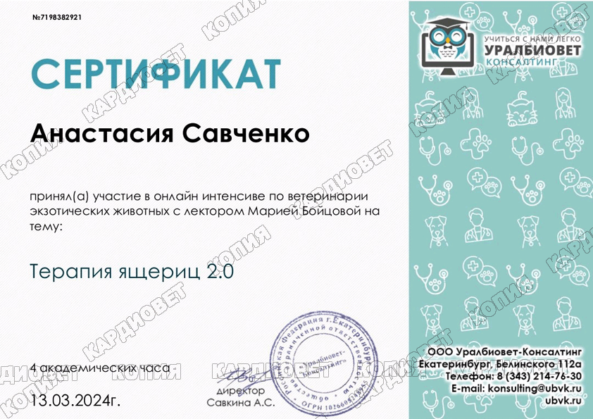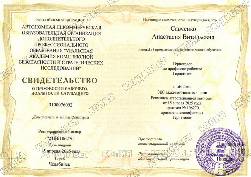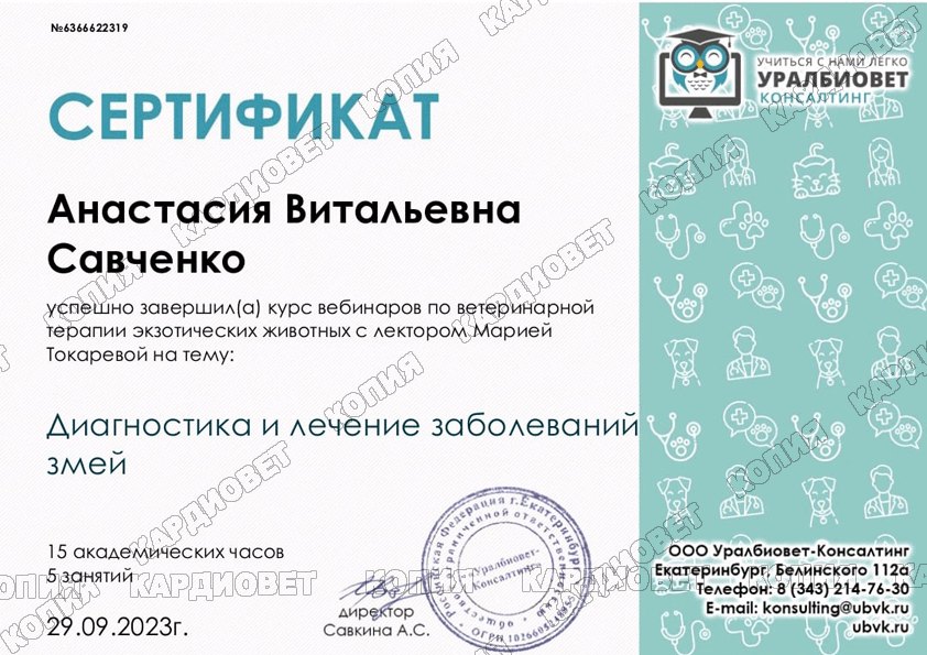 2023 г. - г. Москва - повышение квалификации "Диагностика и лечение заболеваний змей", online, лектор Токарева М. Д. (Бойцова М. Д.)