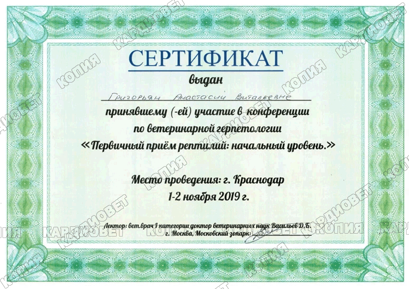 2019 г. - г. Краснодар - Участница конференции по ветеринарной герпетологии "Первичный прием рептилий: начальный уровень", Лектор Васильев Д.Б.