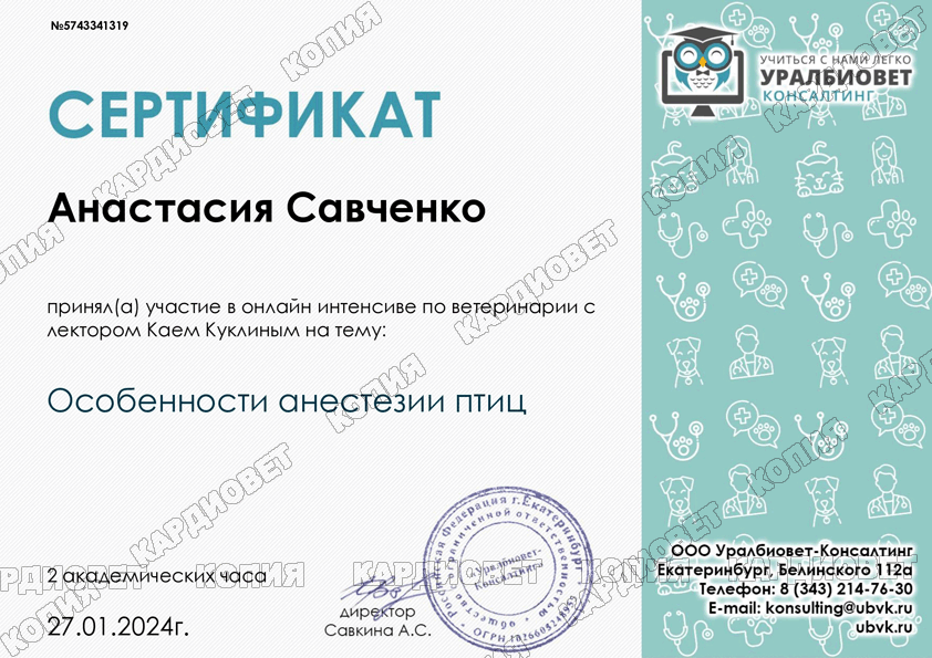 2024 г. - г. Москва - Online-интенсив "Особенности анестезии птиц", от Кая Куклина