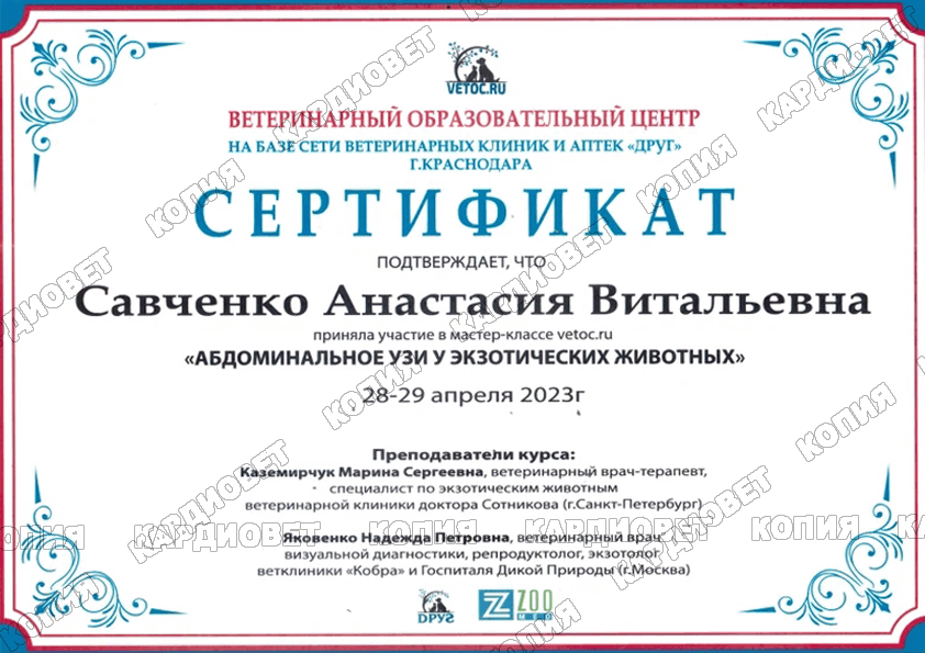 2023 г. - г. Краснодар - участница Мастер-класса "Абдоминальное УЗИ у экзотических животных", преподаватели Каземирчук М.С. и Яковенко Н.П.