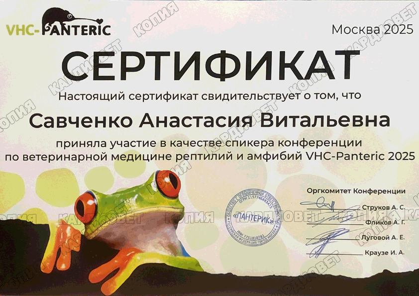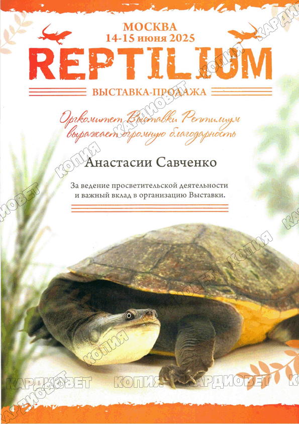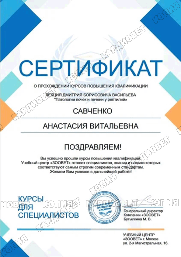 2023 г. - г. Москва - повышение квалификации "Болезни печени и почек у рептилий", лектор Васильев Д. Б.