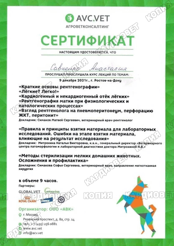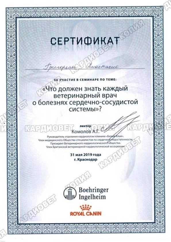 2019 г. - г. Краснодар - Участница семинара "Что должен знать каждый ветеринарный врач о болезнях сердечно-сосудистой системы?", Лектор Комолов А.Г.