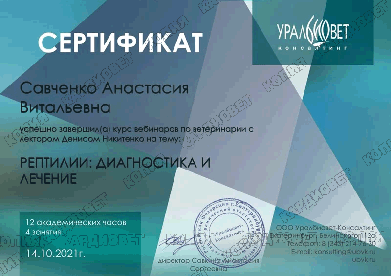 2021 г. - г. Москва - Курс вебинаров на тему: "Рептилии: диагностика и лечение", online. Никитенко Д.С.