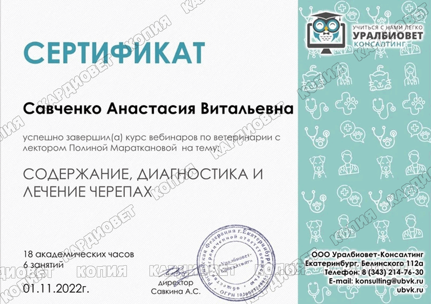 2021 г. г. Москва - повышение квалификации "Содержание, диагностика и лечение черепах", online, лектор Маратканова П.